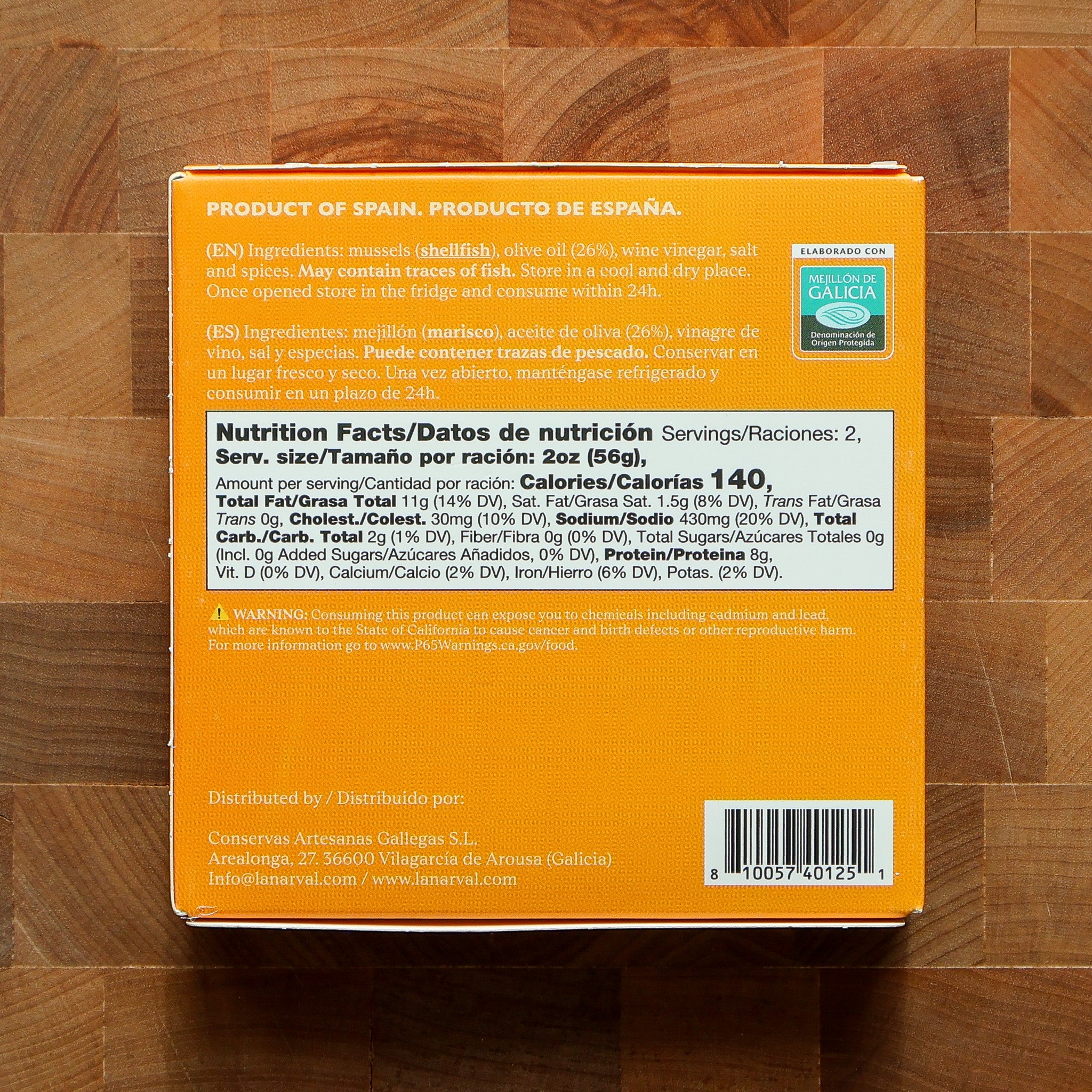 - Ingredients: Mussels (shellfish), olive oil (26%), wine vinegar, salt, spices